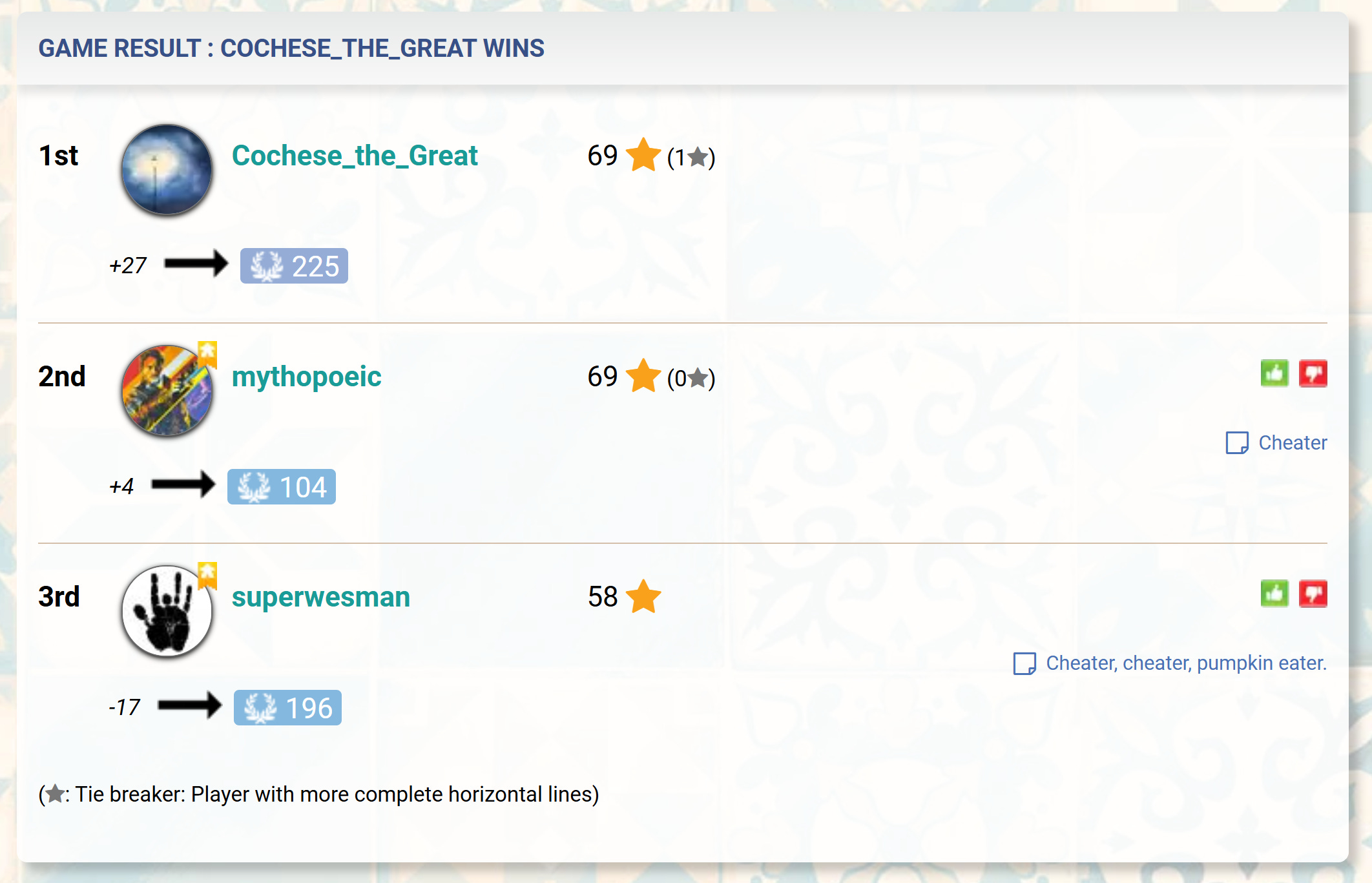 I actually tied with Bizzy in Azul, but the tiebreaker was more horizontal lines so I got first place. Sweet.